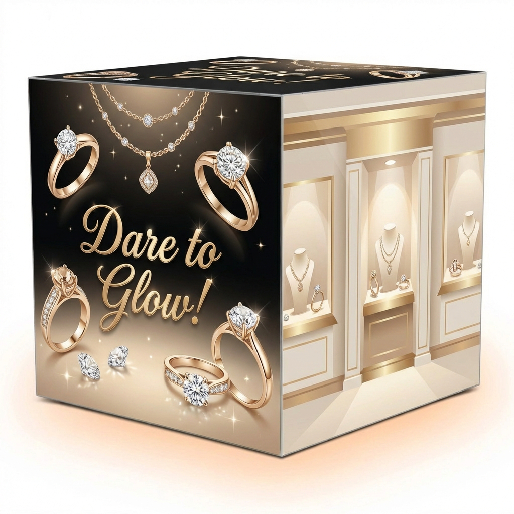 Cuburile Lightbox pot fi amplasate direct pe podea ca elemente individuale sau combinate în structuri de tip totem, pentru un efect vizual spectaculos. Sunt ideale pentru târguri, expoziții sau spații retail. Acest lightbox se poate personaliza integral, pentru a reflecta identitatea brandului tău.