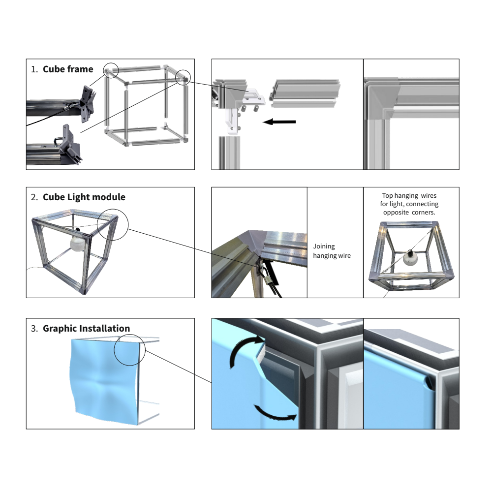 Fețele cubului sunt imprimate prin sublimare directă la rezoluție înaltă pe material textil backlit, cu dispersie luminoasă excelentă.