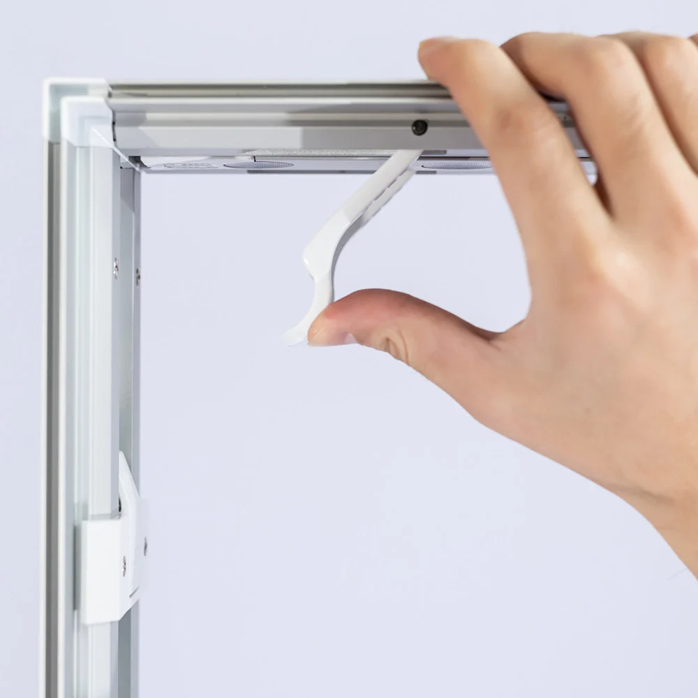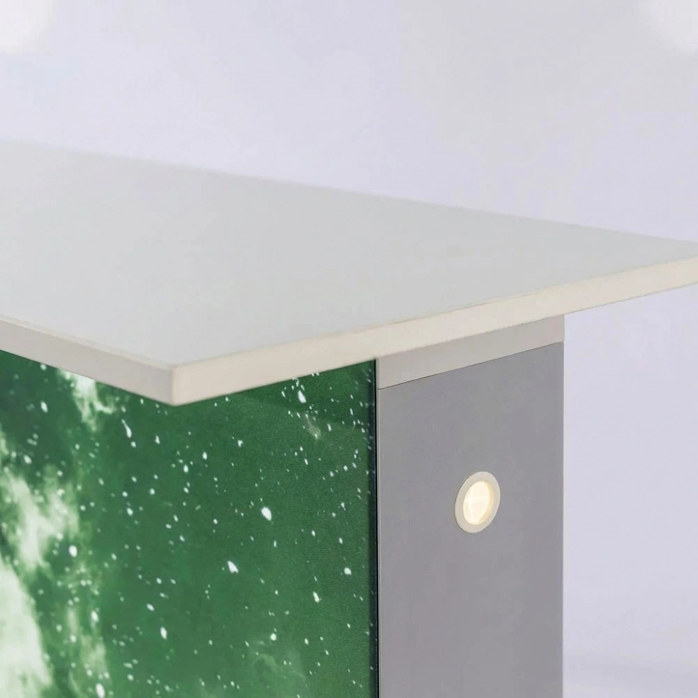 Acest desk poate fi reutilizat de nenumărate ori, iar grafica se poate schimba rapid, datorită sistemului cu cheder siliconic. În plus, poate fi integrat cu alte sisteme tip LightBox pentru un stand complet.