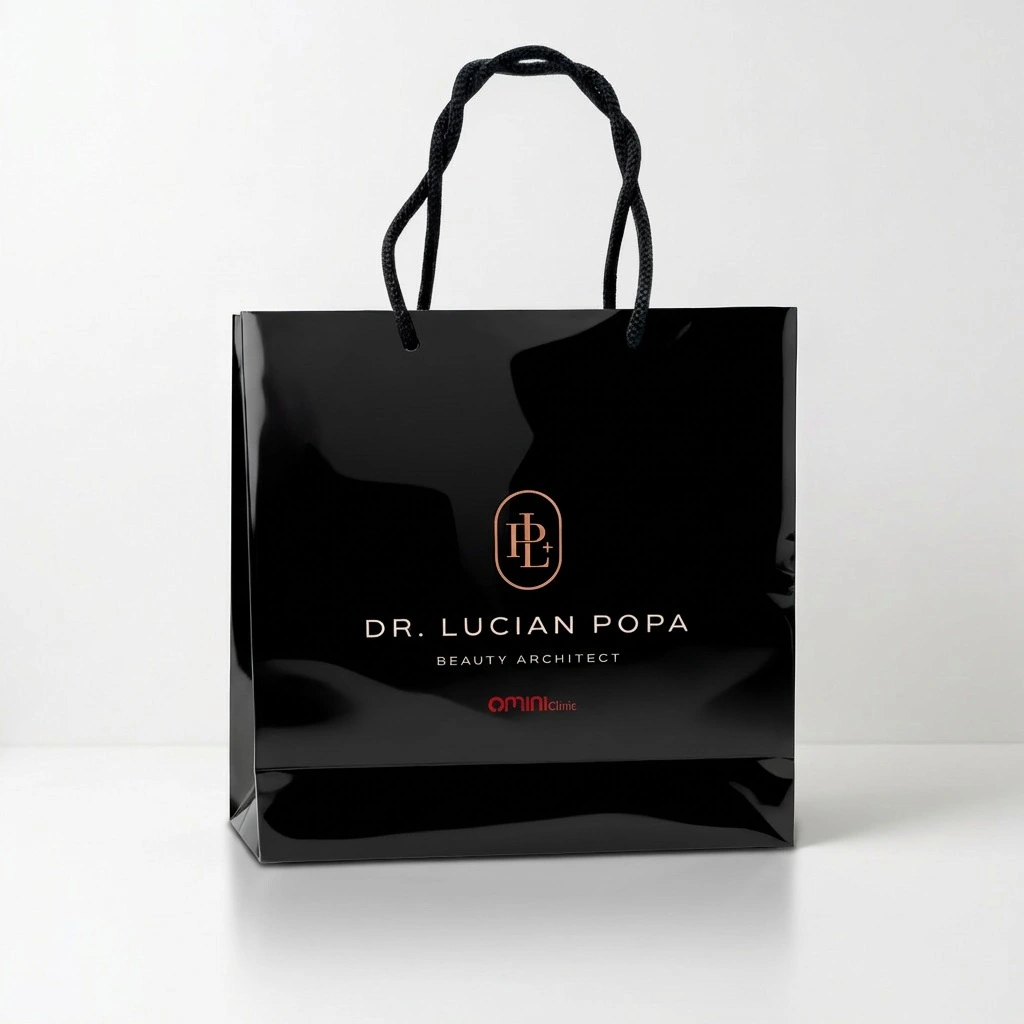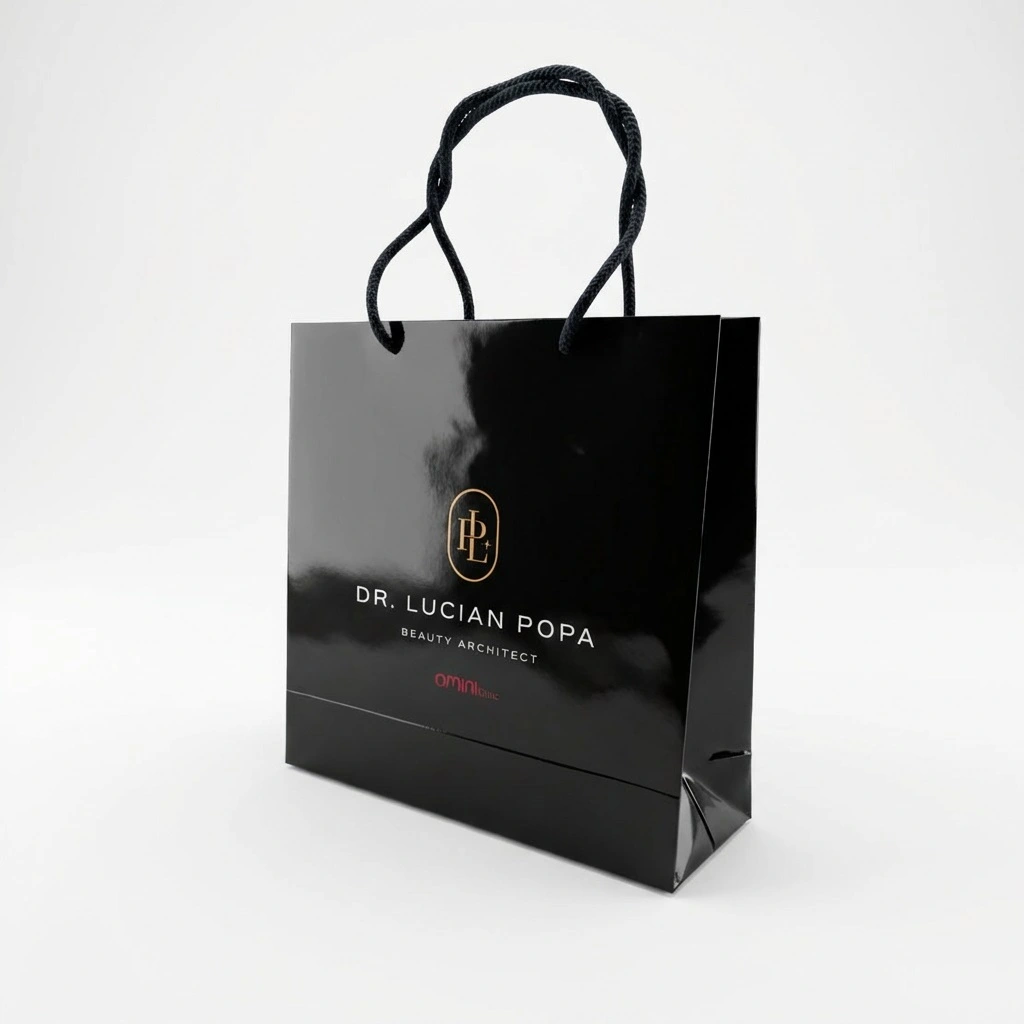 Pungile din hârtie premium personalizate, realizate din hârtie de 200 g, rezistentă și estetică, pot fi finisate cu plastifiere: