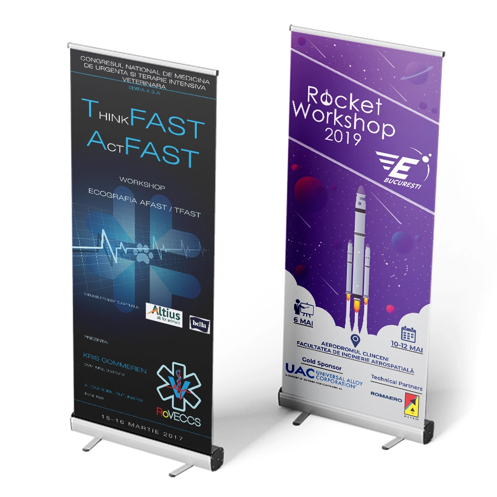 - Cost eficient – comparativ cu alte metode de publicitate, un roll-up banner reprezintă o soluție accesibilă, cu un raport excelent între calitate și preț.